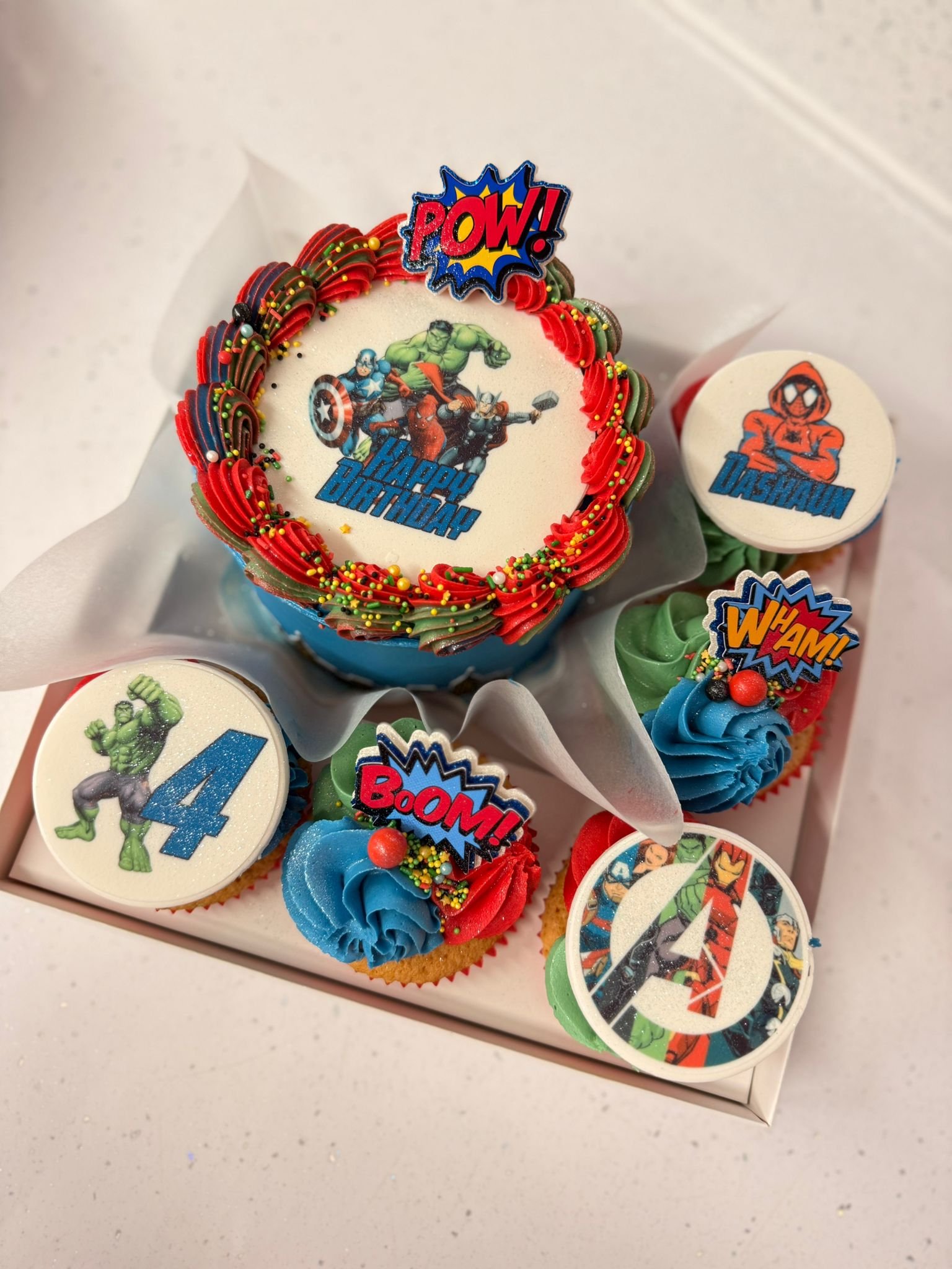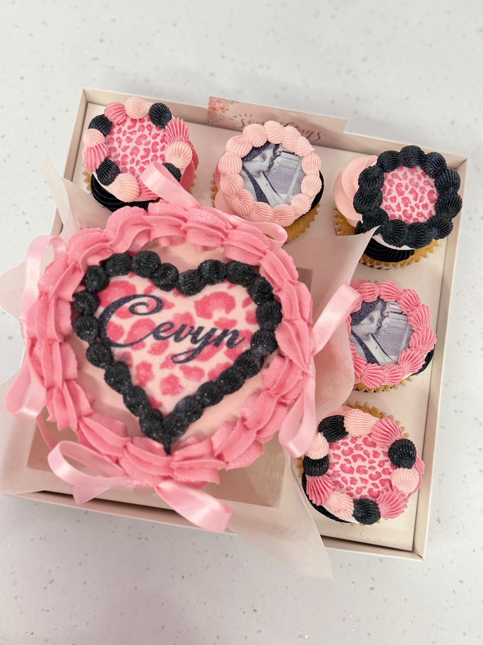 Each box includes a beautifully decorated bento cake paired with matching cupcakes, styled to your chosen theme, colours and design. Every bento cake features a 4” edible image, with 3 matching cupcake edible images included as standard, creating a coordinated and eye-catching finish.